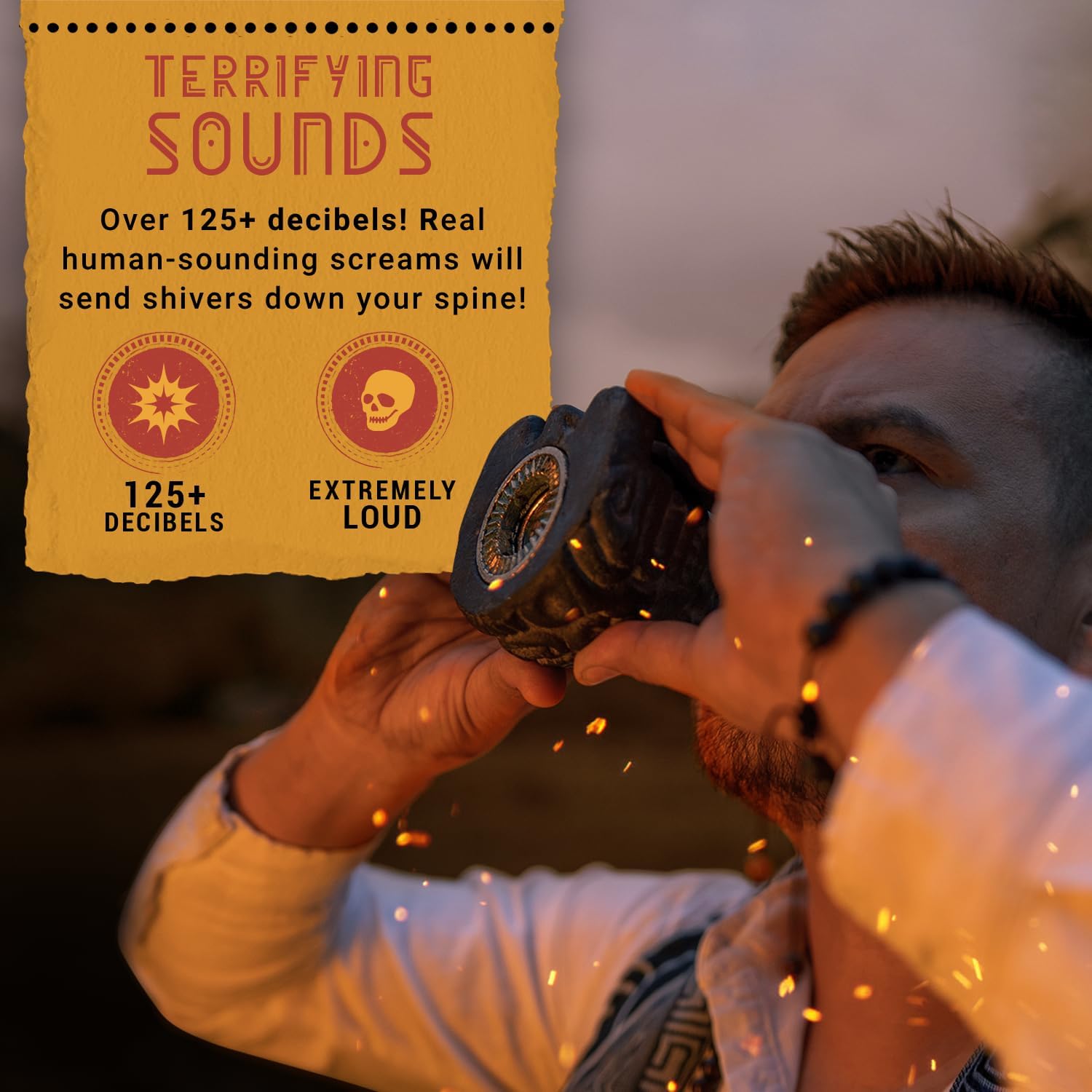 - LOUD AND FEAR-INDUCING: Bone-chilling power of over 125+ decibels. Emits lifelike screams that will send shivers down spines.