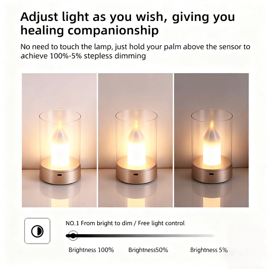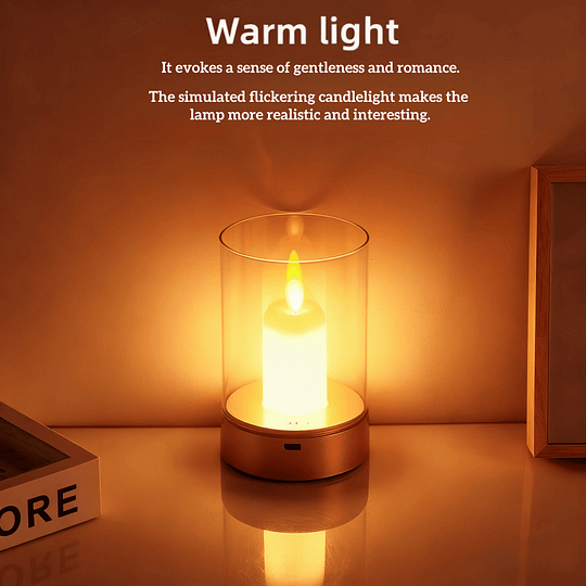 A charming, flame-like LED candle night light takes center stage: soft warm light mimics the gentle flicker of a real candle, while its sleek, matte-white ceramic/glass body exudes elegance. With a simple hand wave (10-25cm distance), the light turns on/off or adjusts brightness—no touching required. Compact and cordless (USB-rechargeable), it casts a cozy, eye-friendly glow that elevates bedrooms, living rooms, or gift-giving moments. Rested on a wooden tray, its realistic candle effect and touchless convenience blend nostalgia with modern practicality—perfect for anyone who loves warm ambiance without the risk of real flames.