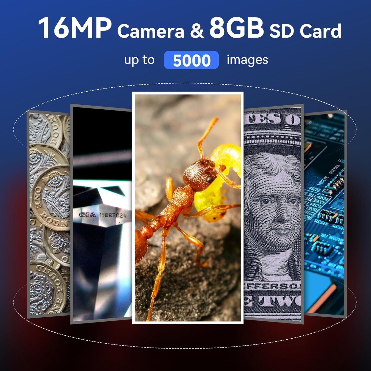 - 16MP Camera & 8GB SD Card: Capture 16MP images with this mini microscope camera, perfect for detailed research, education, and exploration. Ideal for students, scientists, and hobbyists seeking an immersive microscopic experience
