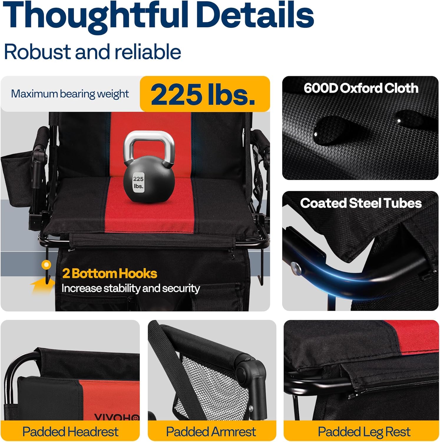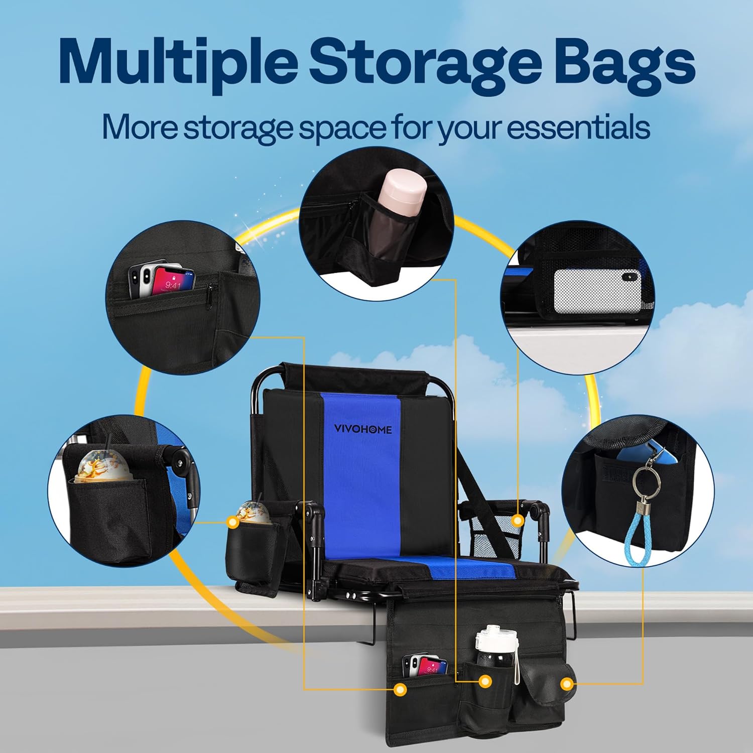 - MORE STORAGE SPACE: The VIVOHOME folding stadium seat features ample storage options, including convenient pouches on each armrest, a front storage bag beneath the seat, and a large rear pocket for bigger items like posters or magazines. Keep your essentials organized and your hands free to enjoy the game
