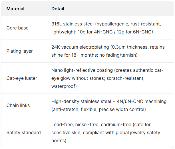 - Vacuum plating process: High-temperature vacuum deposition (even coating, anti-friction, no peeling) + cat-eye luster overlay (scratch-resistant, colorfast)