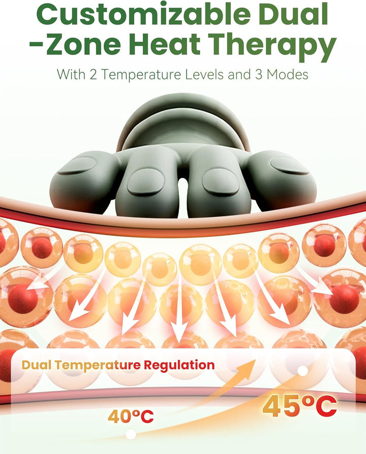 • Customizable Dual-Zone Heat : With 2 Temperature Levels (Adjustable Between 40°c and 45°c) and 3 Modes, The Neck & Shoulder Pro Offers Adjustable Heat Therapy for a Soothing Massage Experience That Simulates the Warmth of Human Hands. Its Dual-Zone Heat Conduction System Provides Consistent Without Sudden Temperature Fluctuations, Making It Ideal for Relieving Tension and Enhancing Comfort in Your Neck and Back, Promoting Relaxation.